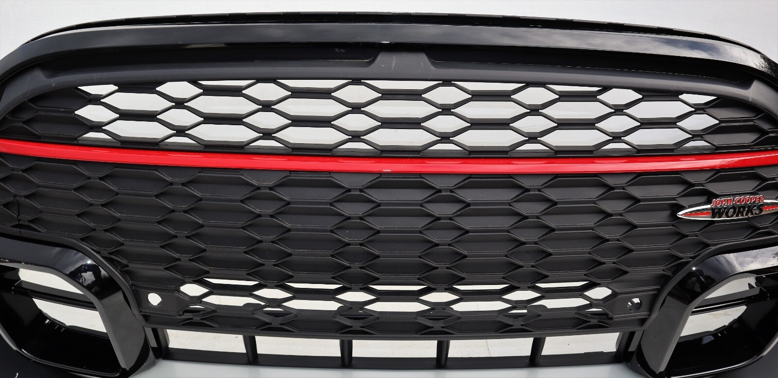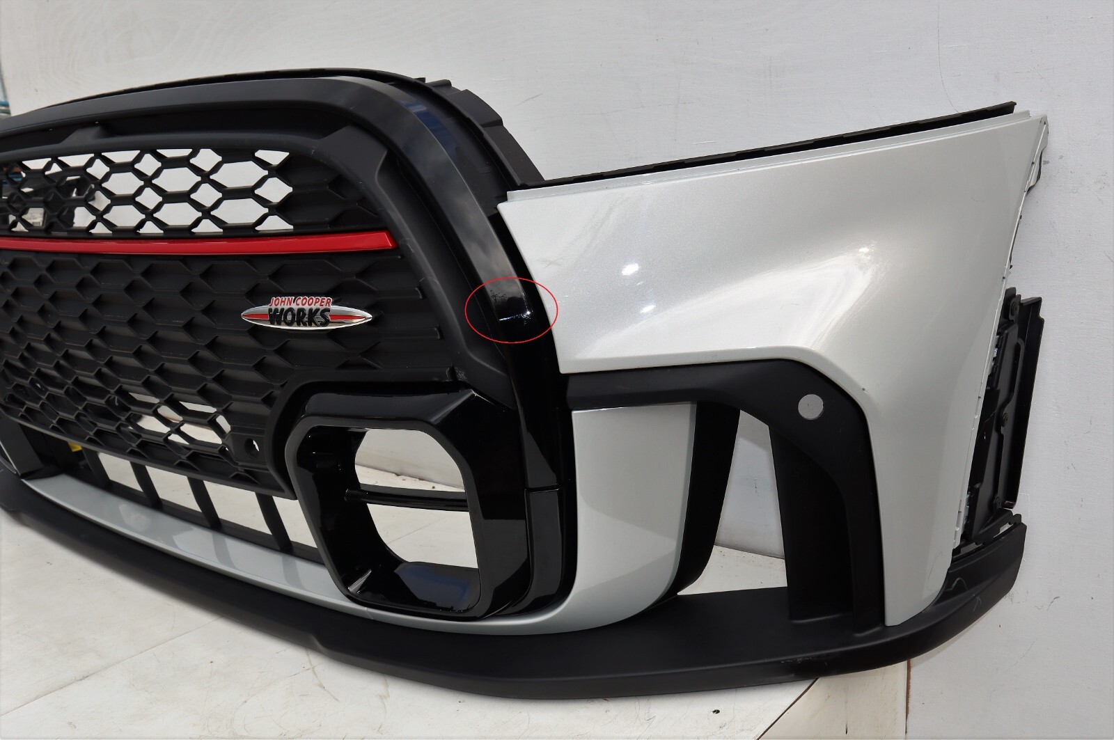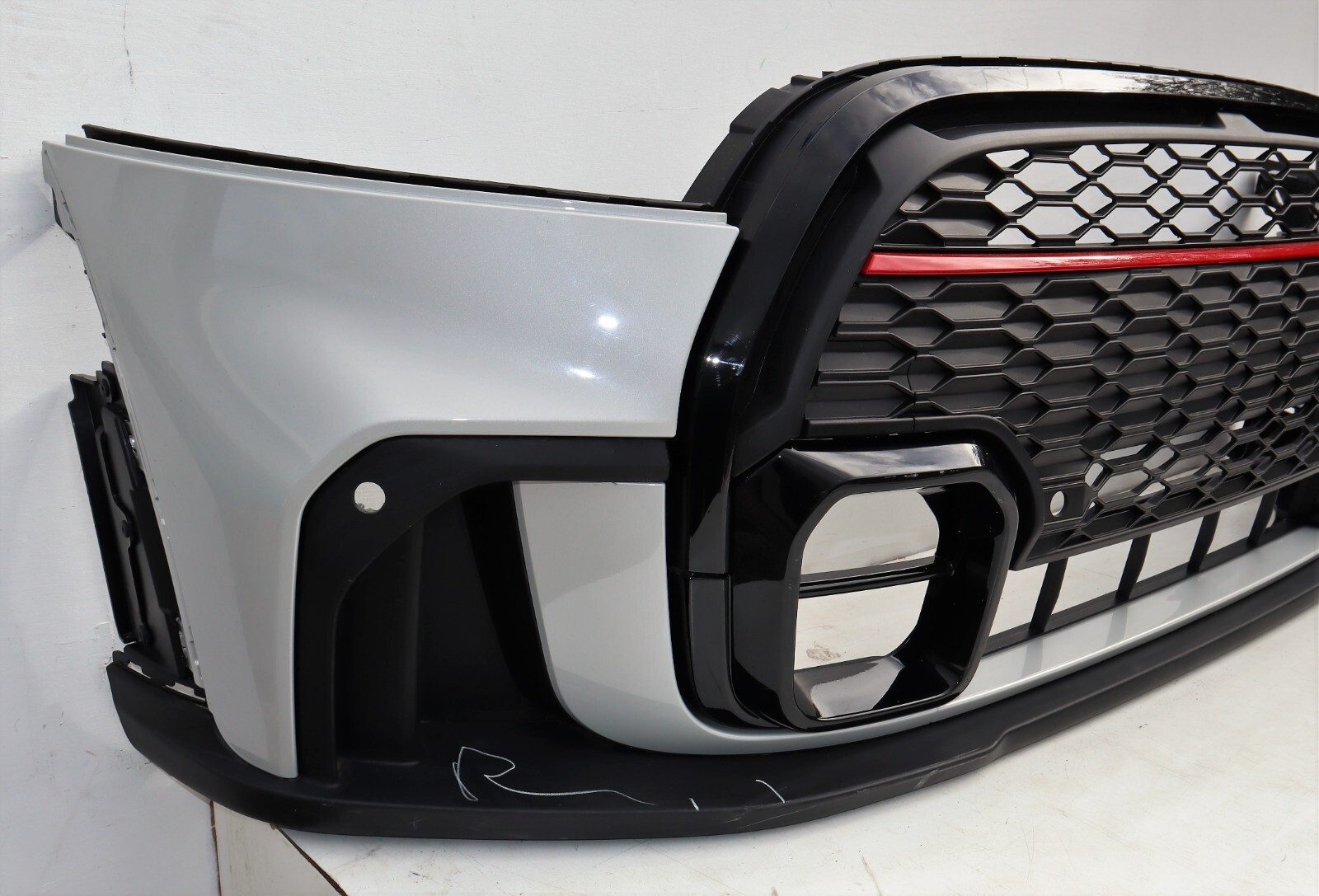 Descriptions & Specifications: Front complete bumper finished in White Silver , Complete bumper, 4 PDC Holes, Include Eye Towing Cover. This is new – never been fitted to the car, however there might some light scratches and dust from transport and Storage. All marks are highlighted if there’s so please inspect the actual photos as much as possible. There’s a cut in the middle of the top grille. List of parts needed or to replace for conversion from none JCW: New washer bottle, crash bar foam, lower crash bar & brackets, new splash guards (jcw), new wheel arch trims, new radiator air guides (jcw) new top air guide to bumper bracket. Free Postage within United Kingdom only. Dispatch: Same Working Day.
