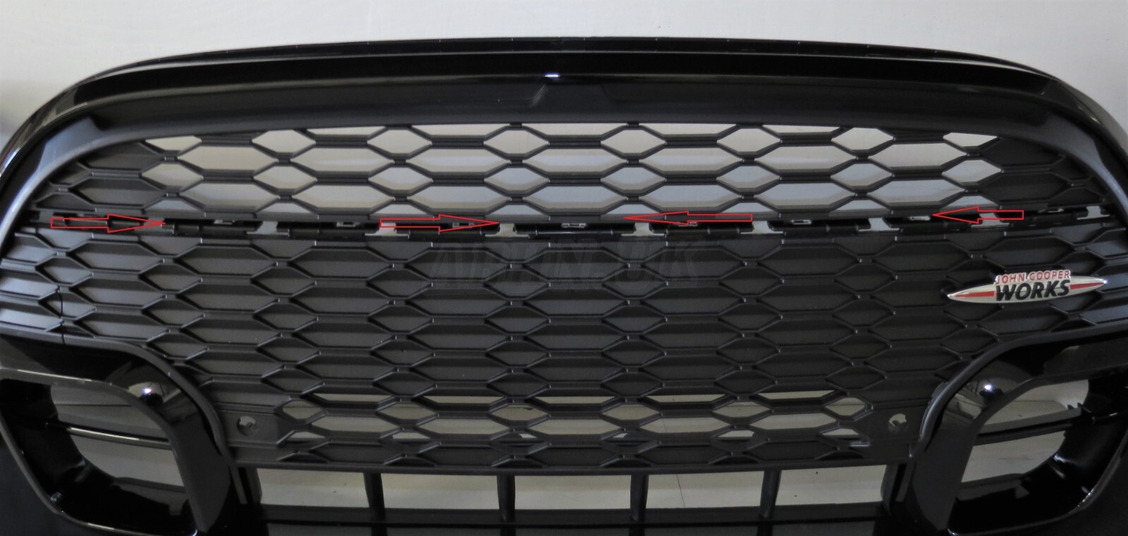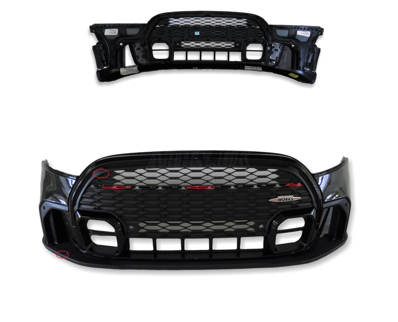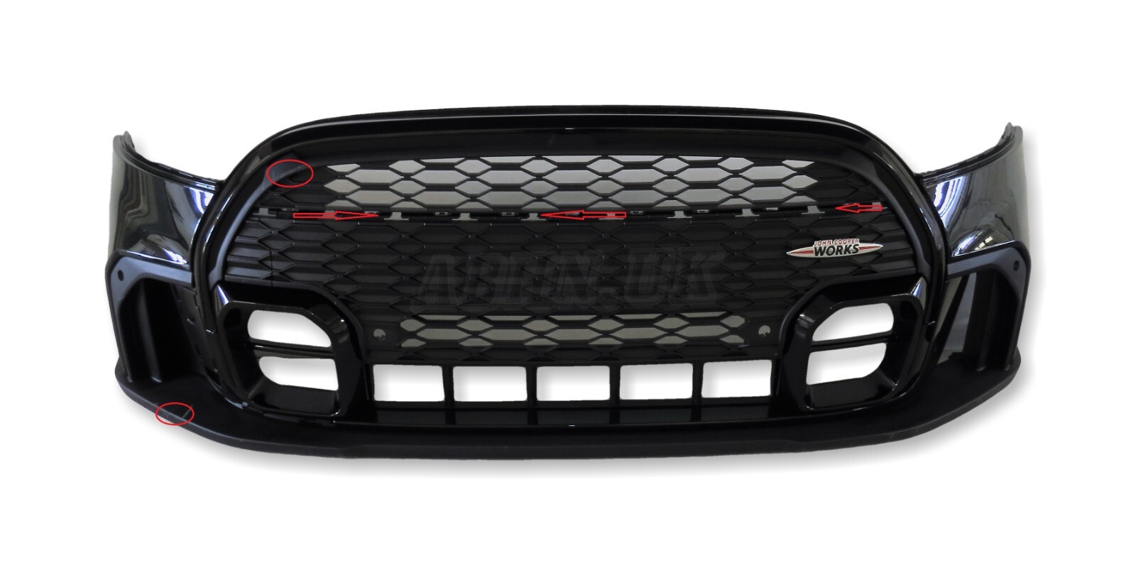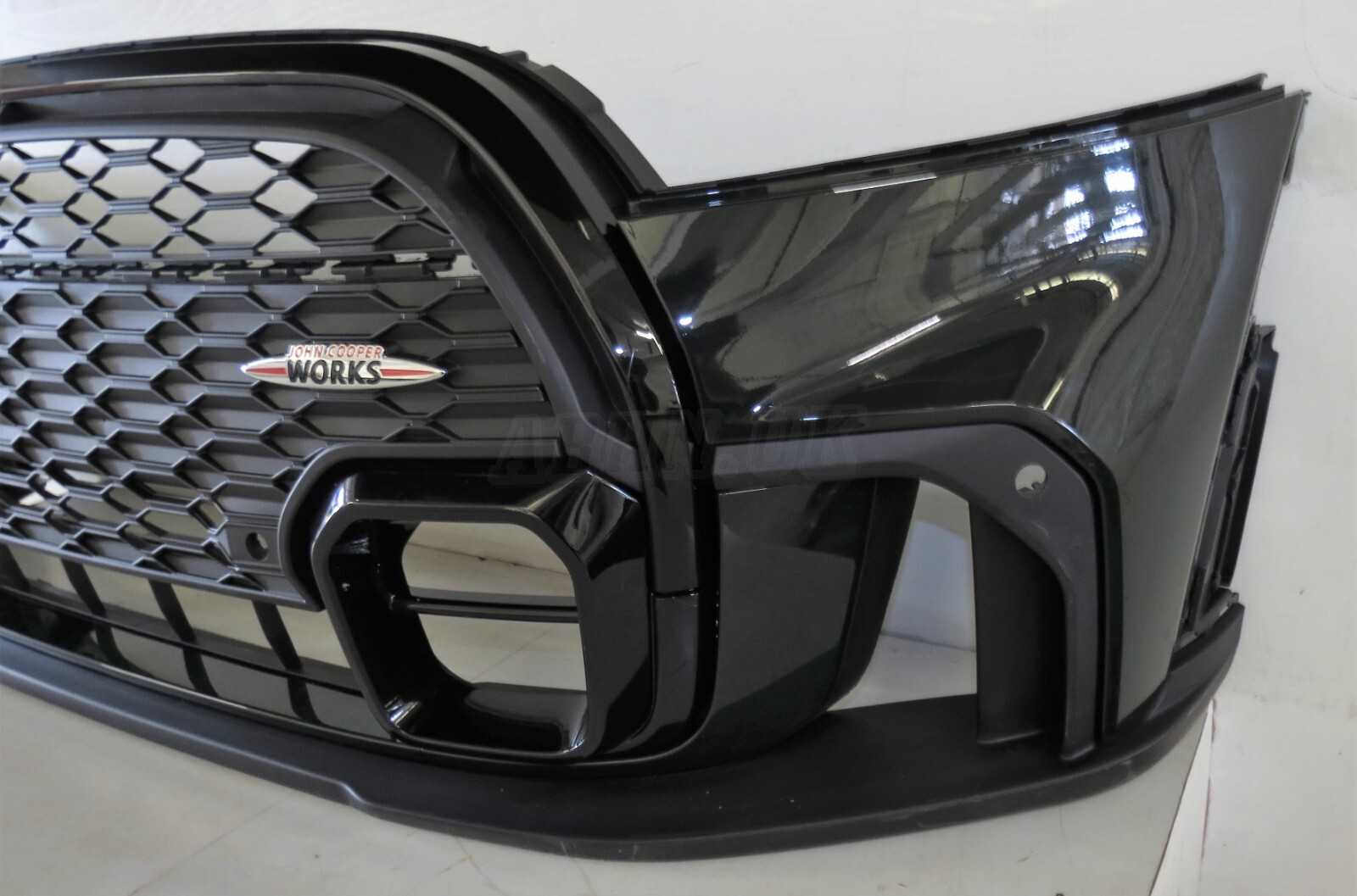 John Cooper Works Front Bumper finished in Rebel Green, Badge, 4 PDC hole bracket, Eye Towing Cover is included.